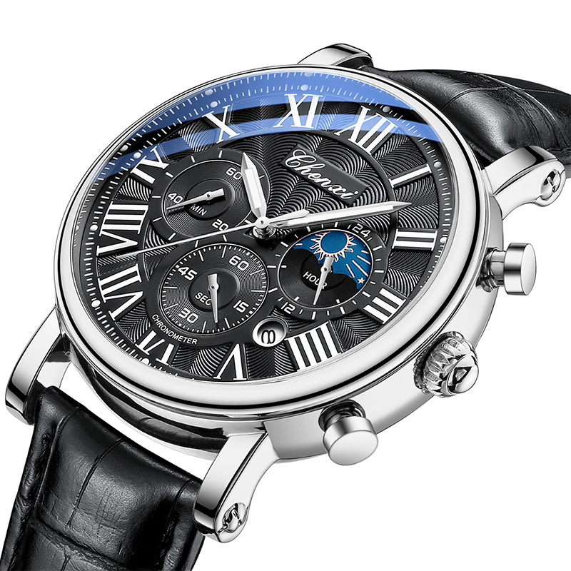 腕時計男性用真皮多機能三眼六針夜光防水ファッション石英時計真皮日月星2024