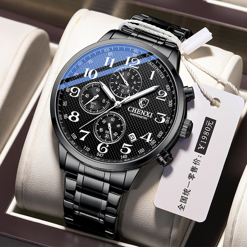 腕時計男性用多機能生放送の爆発防水夜光三眼六針シリカゲルカレンダーのファッション表2024新型