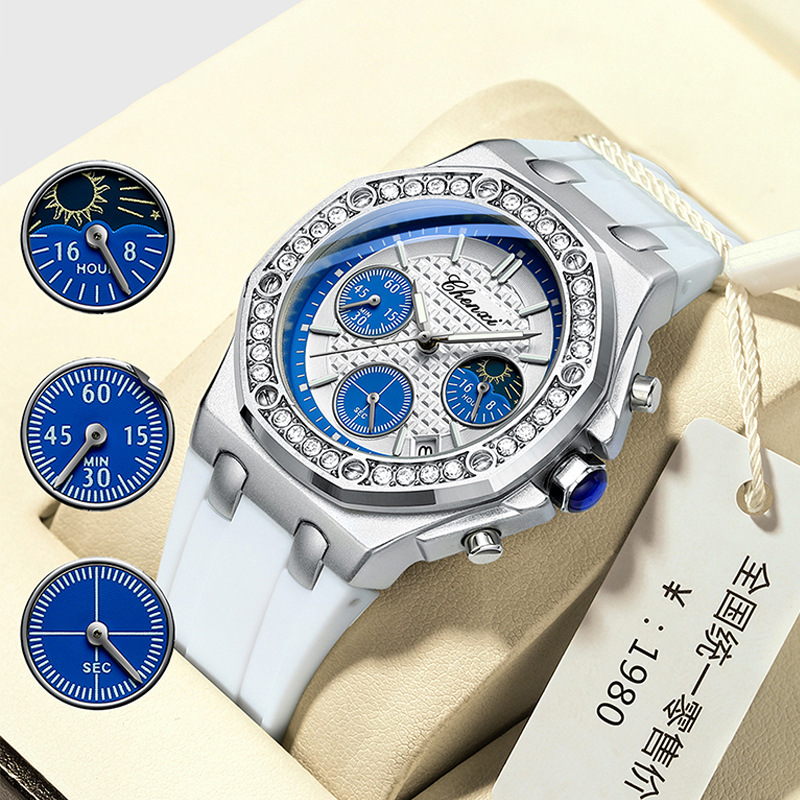 CHENXI朝セイ多機能レディース腕時計月相計時三眼入ドリルカレンダークロスボーダーシリコン女性時計912L