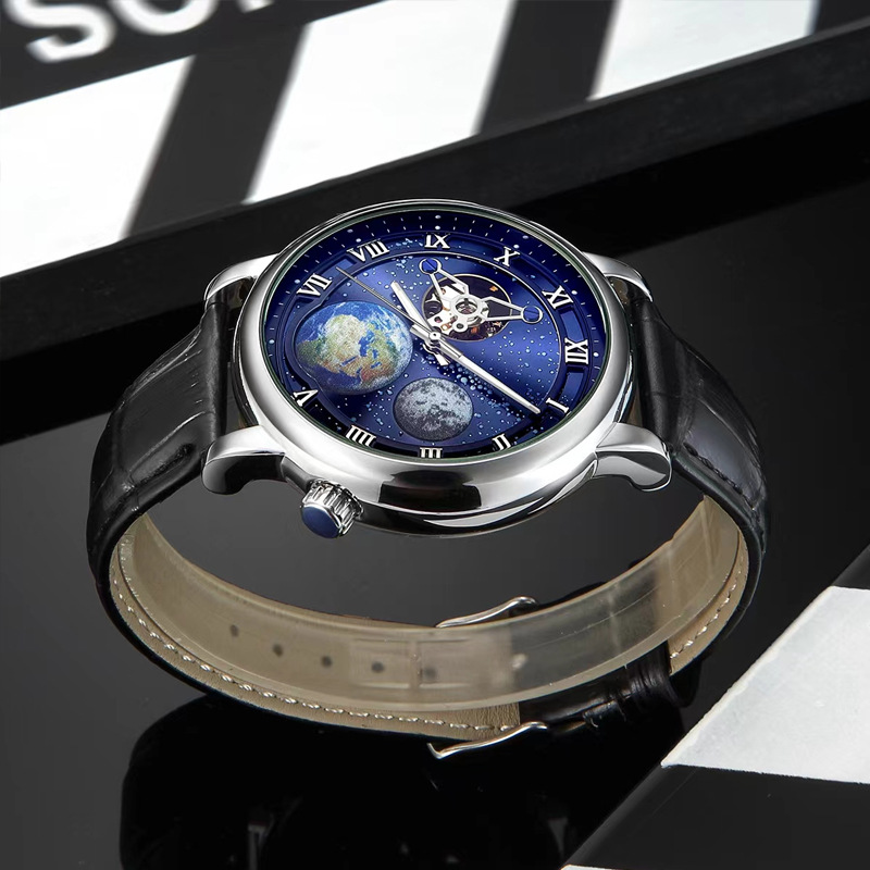星空地球月夜光腕時計男機械時計全自動牛皮防水大気透かし男時計