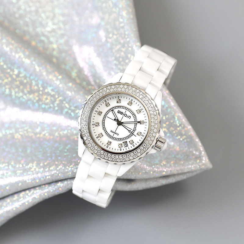 古典的な白い陶磁器の腕時計を生放送します。