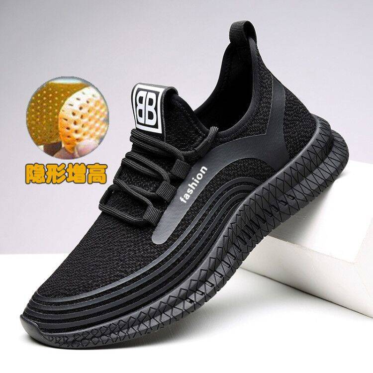 2022新型ネット紅低組前ひも飛織男靴丸首黒厚い底純色男靴shoes
