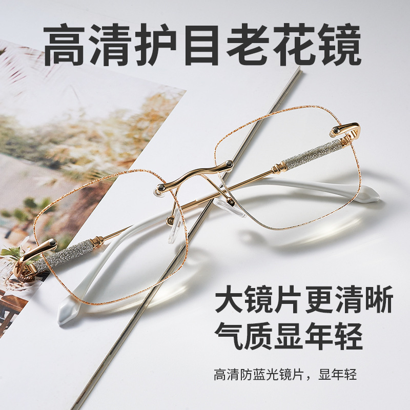 新しいフレームレスエッジカットダイヤモンド付きファインフラッシュ老眼鏡、ファッショナブルなリトルレッドブックと同じスタイル、抗ブルーライトスポットフラットミラー