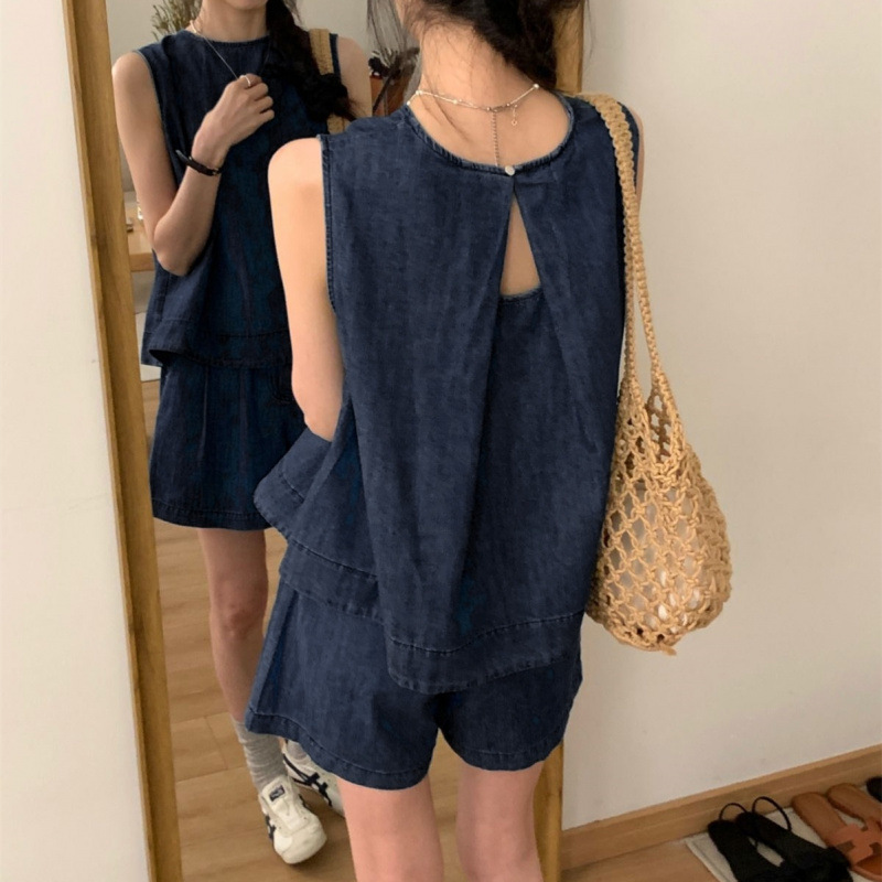 夏のレディーススーツ新しい韓国スタイルの小さな女性の年齢を減らすファッション弾性ウエストショーツツーピースデニム/
