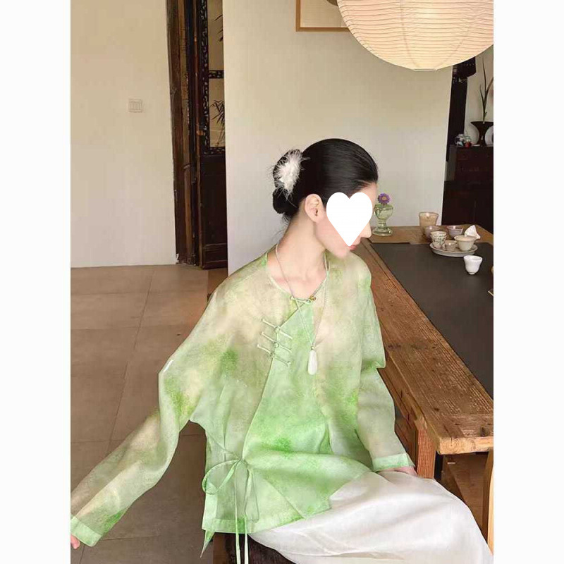 2025 ユニークでシックなタイダイその他小柄な長袖夏禅風ボタン日焼け止めシャツグリーントップ