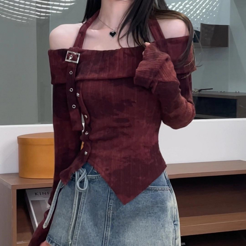 春先の新デザイン、ワンラインカラーショルダータイダイ長袖スリムフィットで肉感をカバー、スリムでエレガントな甘いスタイルのトップス6500