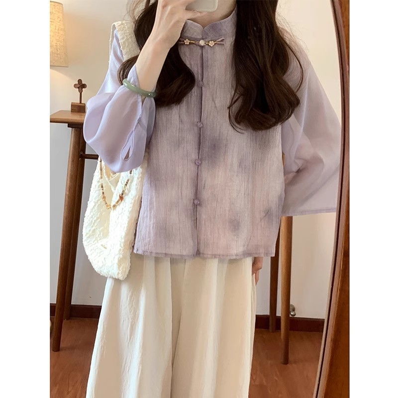 ライトナショナルスタイルパープルスマッジ新チャイナシャツ2025春新作フェアリーステッチナショナルスタイル改良レトロ