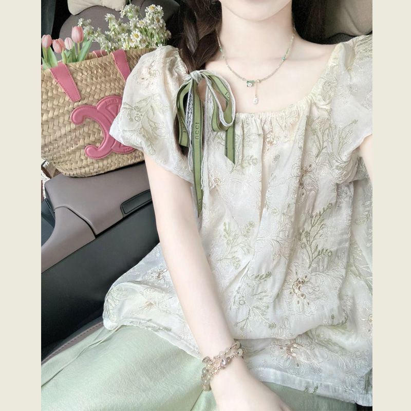中国風の新しい中国風の刺繍ジャカードフライングスリーブレディース夏の新しいニッチハイウエストワイドレッグパンツ2点セット