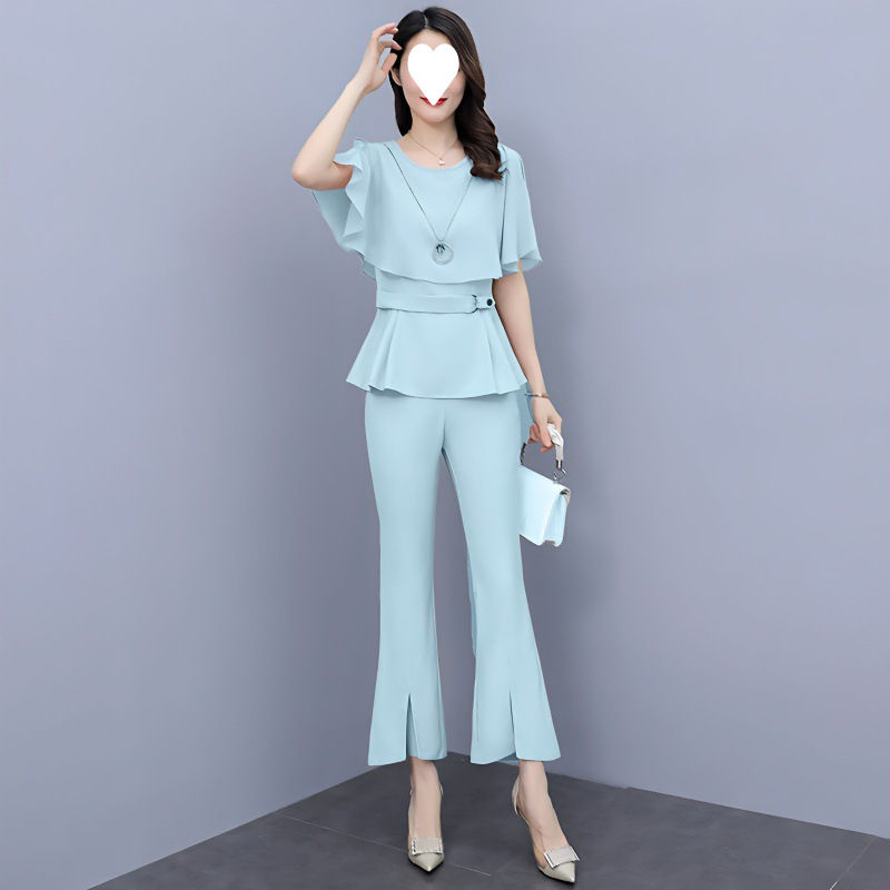 2025年夏の新しいティースタイルの服装、女性用の気質カジュアルな無地、スプライス日焼け止めフライングスリーブスカートの完全なセット