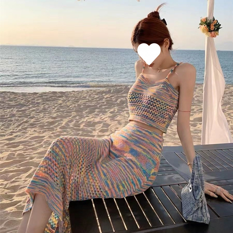 韓国風サマーリボンデザイン中空ニッチトップストライプキャミソールハイウエストスカート2点セット