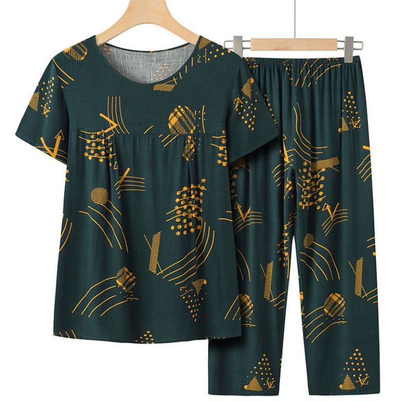おしゃれなプリント半袖ツーピーススーツ、トップスとパンツ、中高年ママの夏服、ゆったりカバー肉カジュアル大きいサイズスーツ
