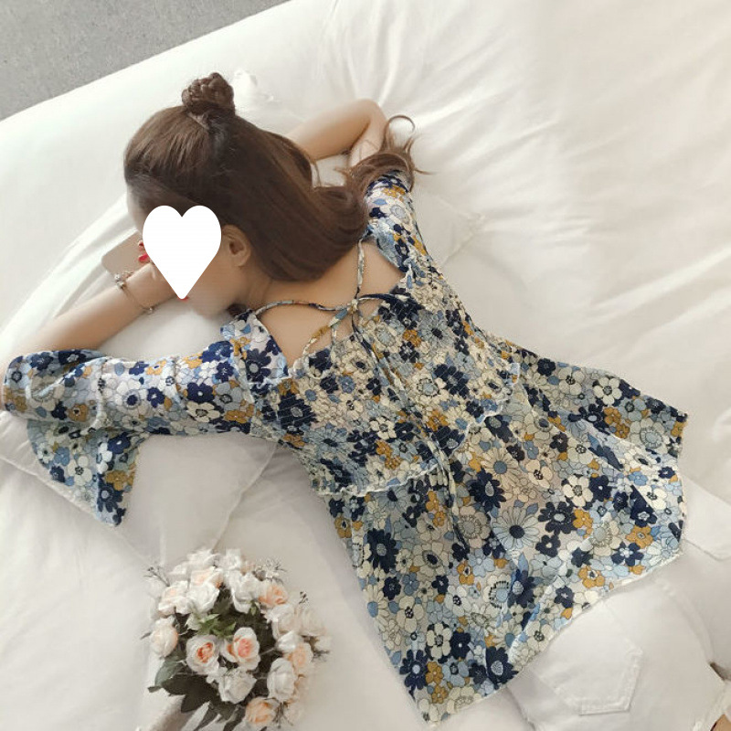 2025 夏の新作甘いファッションフェミニン社交家ディープカラールーズフレアスリーブプリントシフォン/ポリエステル (