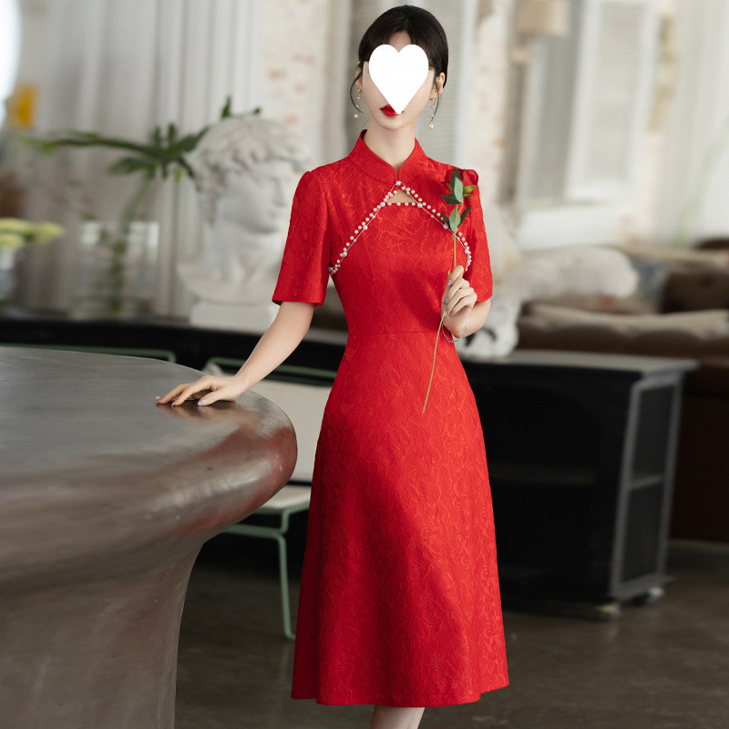 人気のセクシーな高級チャイナドレス女性のための 2024 夏の新しい中国風エスニックスタイル半袖スリムジッパー、レース、純粋