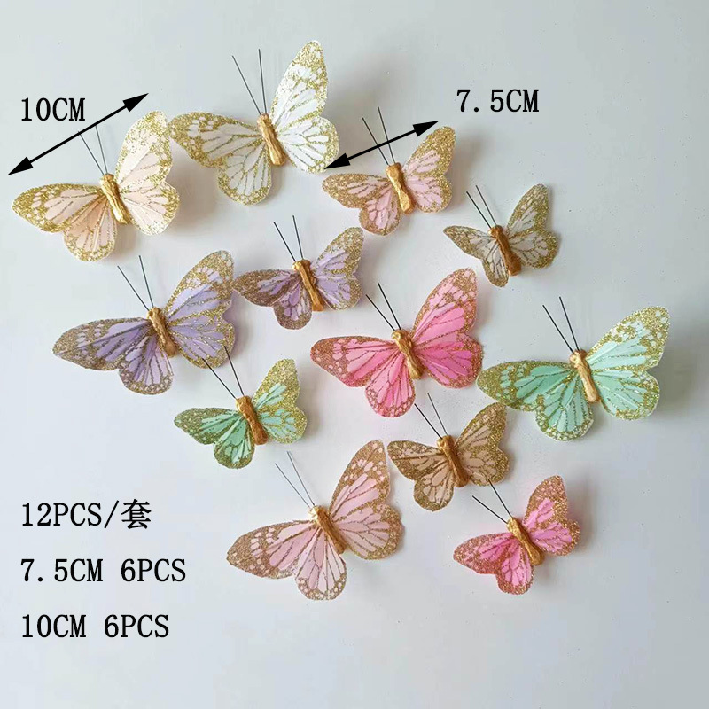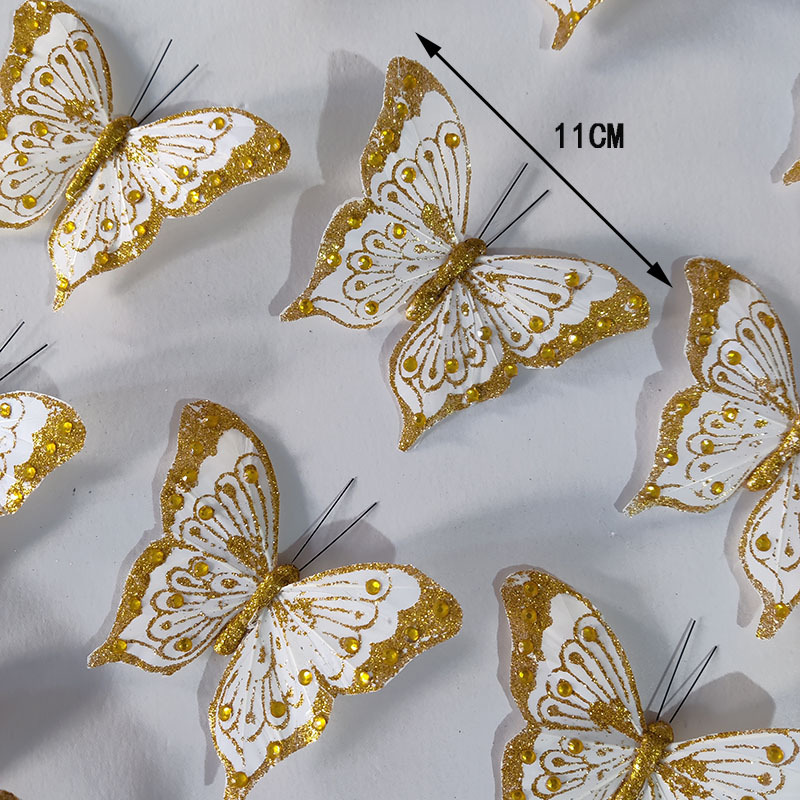 11cm金粉の軽い豪華な羽の蝶のシミュレーションの蝶の結婚祝いの装飾の壁はクリスマスの花の花輪を飾ります。