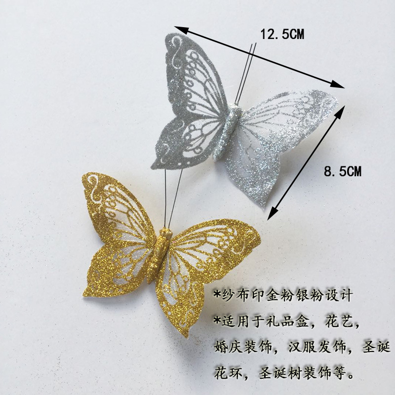 金粉の羽根蝶、模造蝶、結婚式のフラワーアレンジメント、クリスマスの装飾、簪、花嫁のヘアアクセサリー、ハロウィーンの装飾