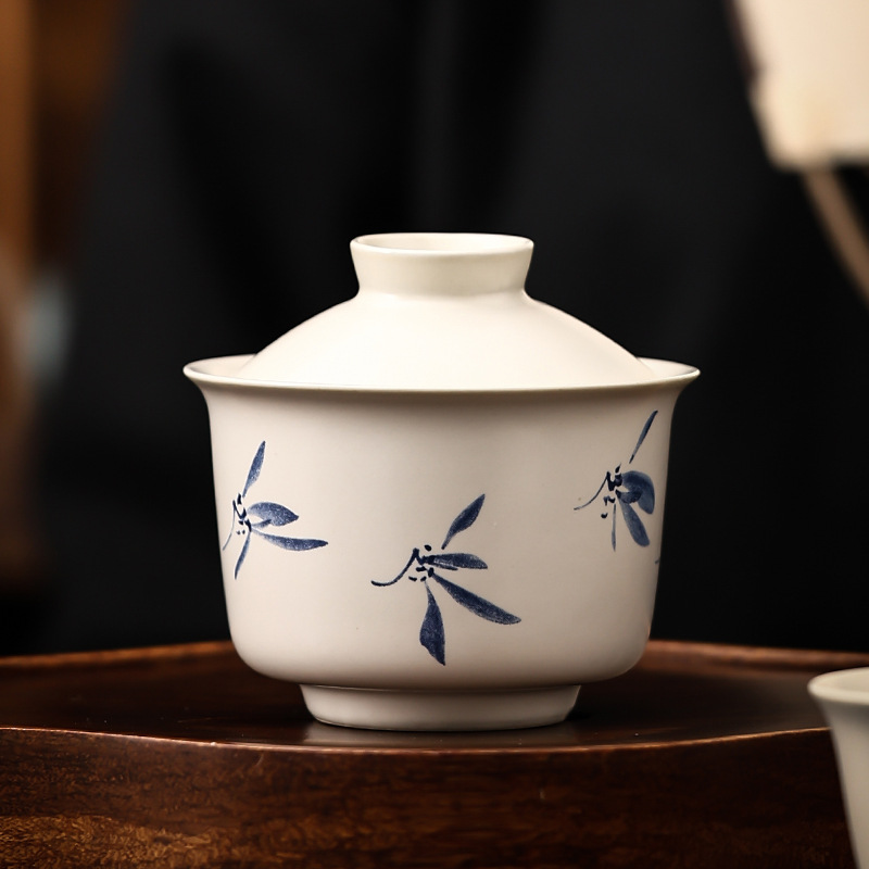 日本の工芸シンプルな草と木の灰色の陶磁器の三才の蓋の碗の復古の家庭用の工夫の茶器のアイデアの小さいサイズの文人
