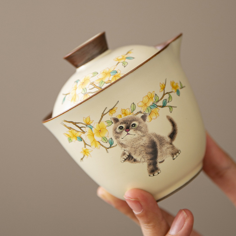 旅行手掴み陶磁器ティーポット桂花猫汝窯茶器セット一壺二杯携帯屋外キャンプティーカップ
