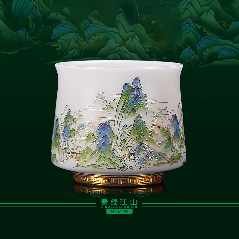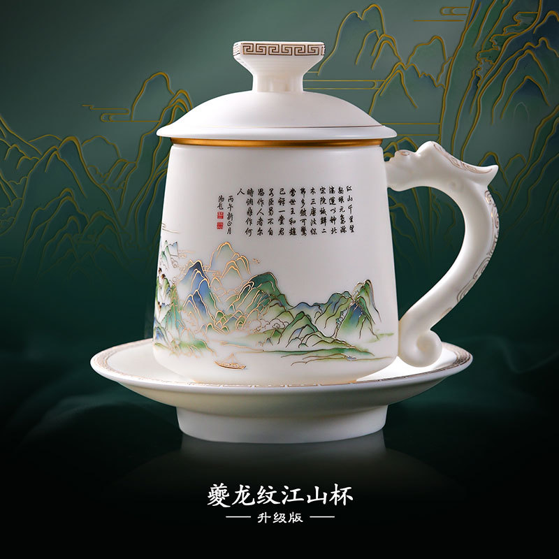 徐建勇大師オリジナル千里江山ティーカップ茶水分離羊脂玉磁器オフィスカップ男性プレゼント家庭用