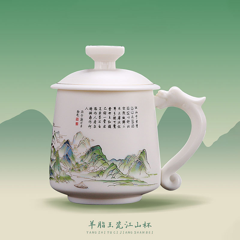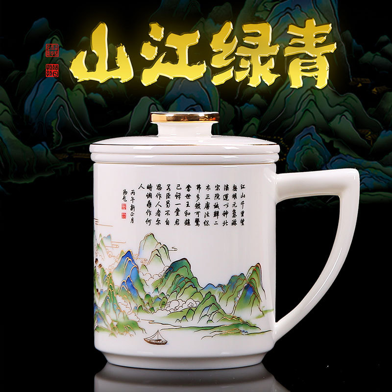 オフィスの接客カップ青緑江山カップ羊脂玉オフィスカップ高級ビジネスカップ
