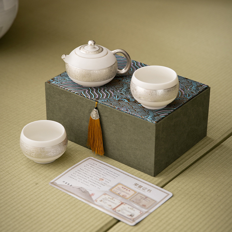 羊脂玉白磁茶壺セット高級景徳鎮999銀茶具一壺二杯家庭用プレゼント