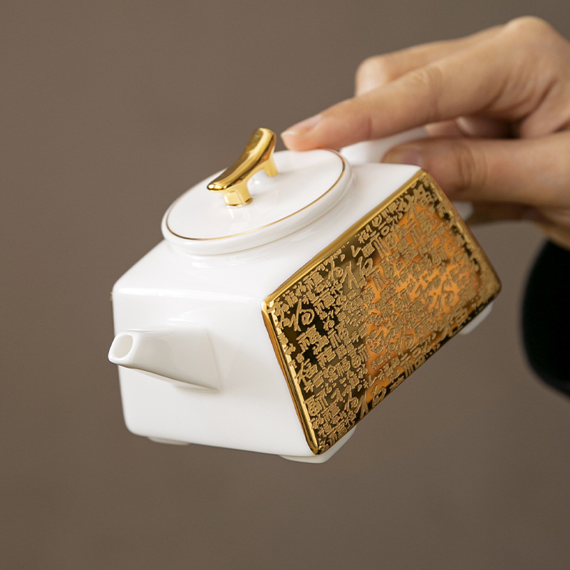 羊脂玉磁器の純度の高い金百福のティーポットの家庭用高級な白磁の大容量の茶器にお茶を入れます。