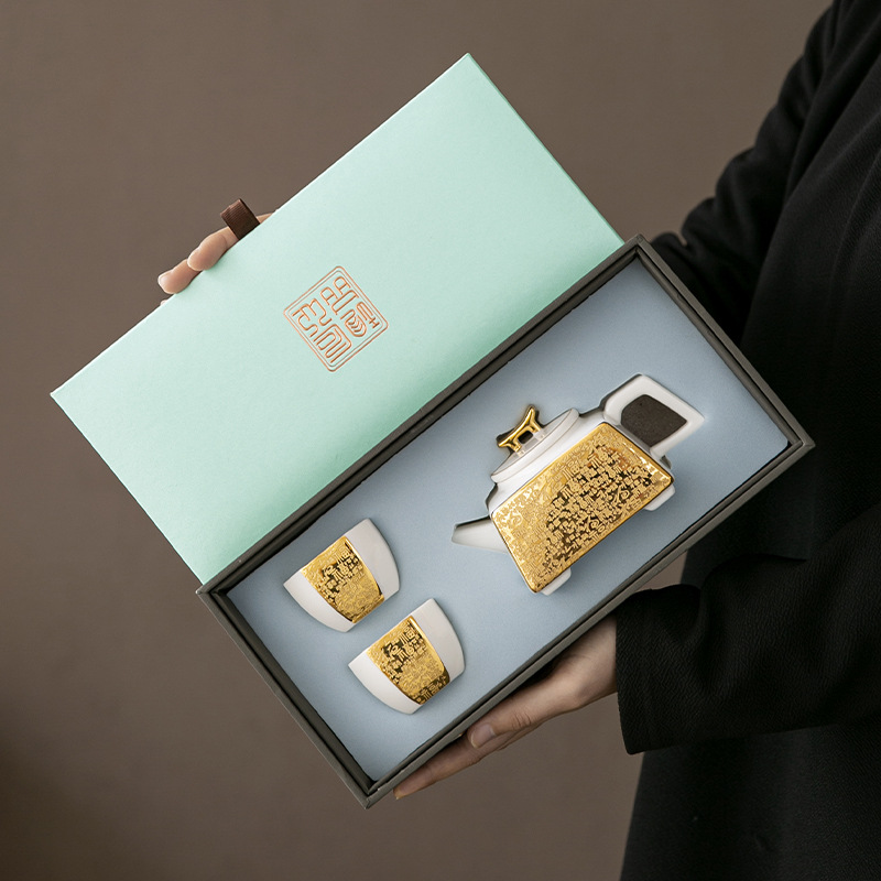 純金茶道具羊脂玉一瓶二杯礼箱文創喬迁新婚父男男父退職誕生日礼
