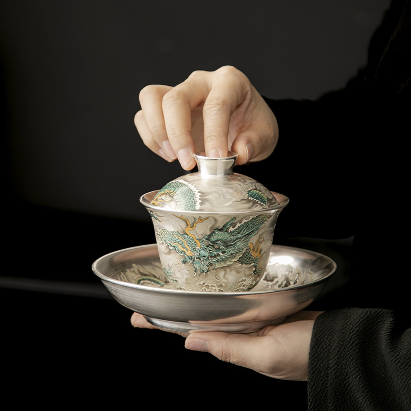 999純銀三才蓋碗単一の中国式高級茶器は手に火をつけないで、銀の工夫茶器は銀の壺をプレゼントします。