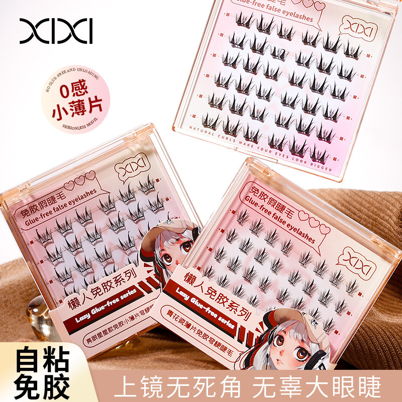 xixi ナチュラルスモールフレーク接着剤不使用の湾曲したステムまつげシングルクラスター厚いカーリングセグメント化された青と白の磁器つけまつげ