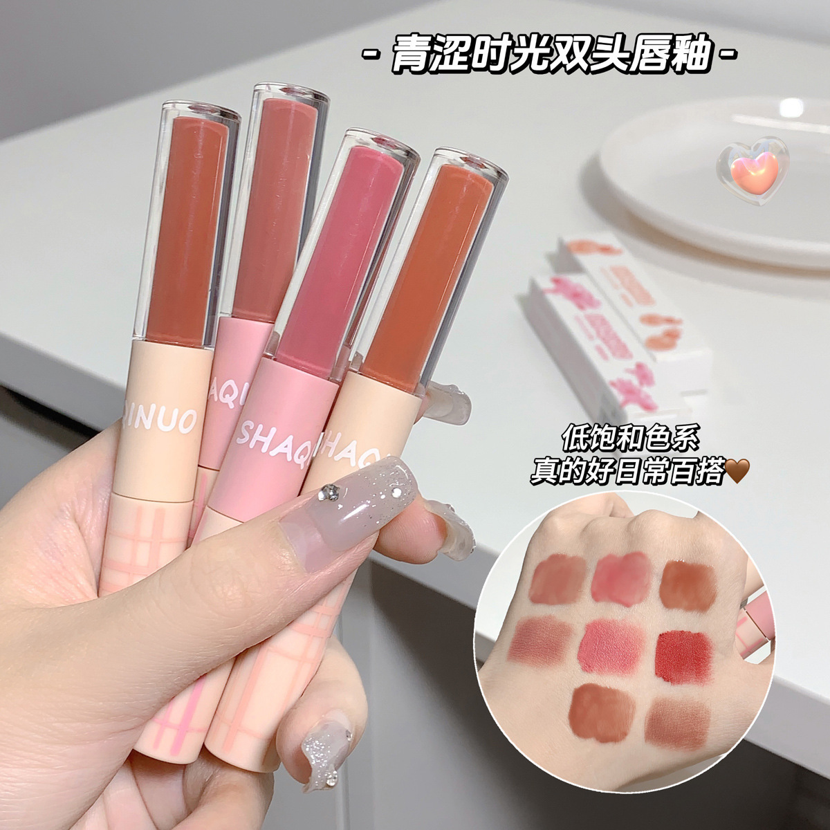 SHAQINUO 青い若々しい時間双頭リップ釉薬ミラーウォーターライトリップグロスマットマットベルベット口紅手頃な価格の美容