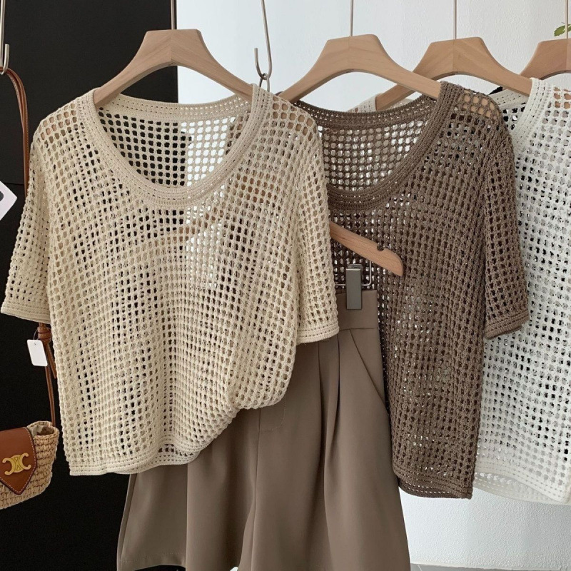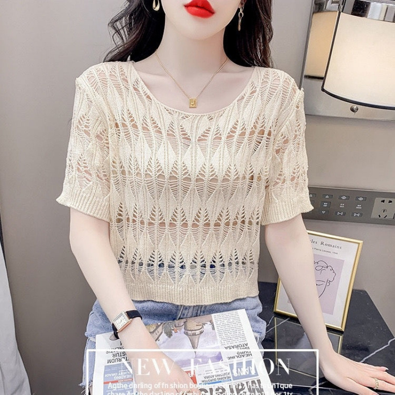 女性のための中空ニットセーター夏の新しい薄いスタイルの半袖ブラウスデザインルーズニッチショート日焼け止めシャツ
