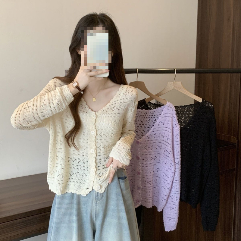 夏中空ニットカーディガン新しい女性の薄い襟薄いコート空調ショール日焼け止め長袖ショートトップ