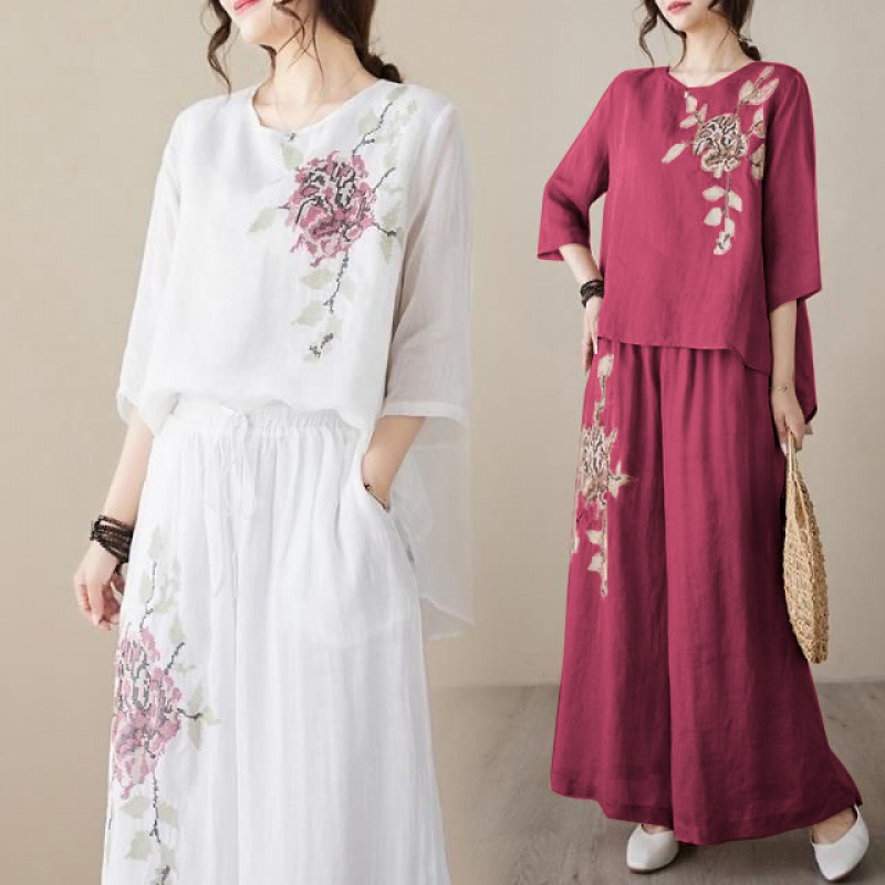 綿とリネンのレトロな刺繍スーツ女性の夏のプルオーバーファッションシャツ軽量ワイドレッグパンツ痩身ママツーピーススーツ