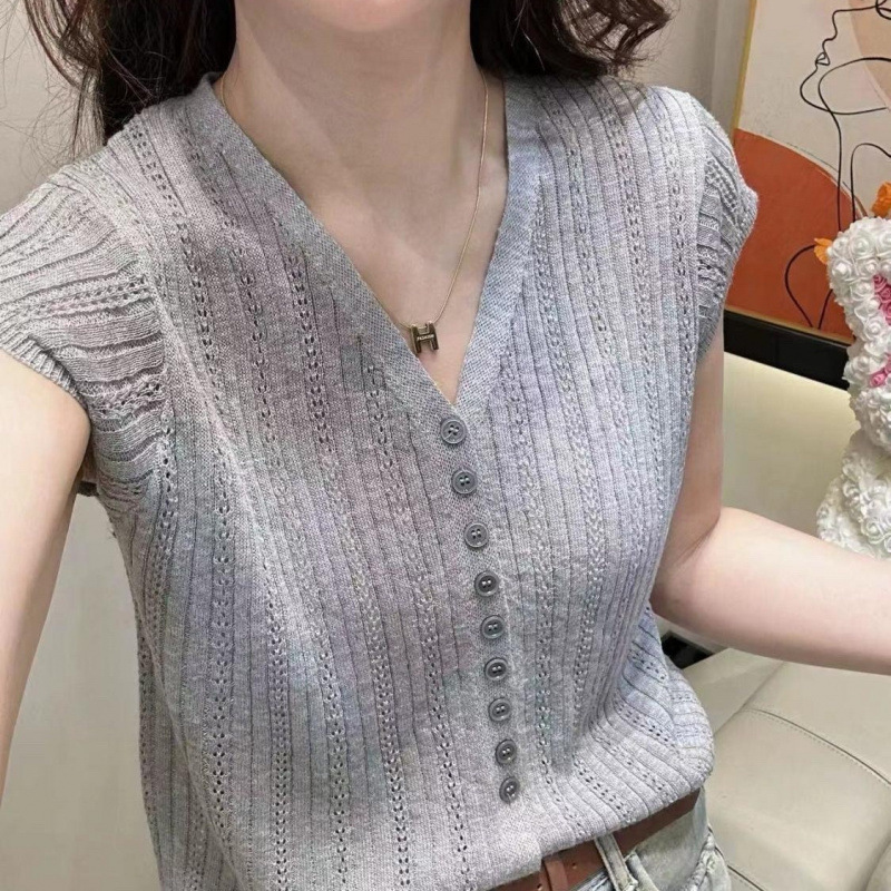 Vネック半袖多用途ニットセーター、夏用女性用、スリムフィット、ユニークで超見栄えの良い美しいトップ、薄い黄色のカラーボタン