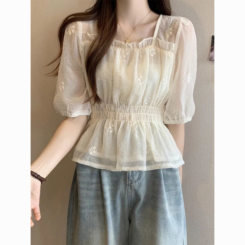刺繍入り耳付き小香風シフォンシャツ夏ショートフレンチスイートスタイルシャツレディーストップスシフォン半袖