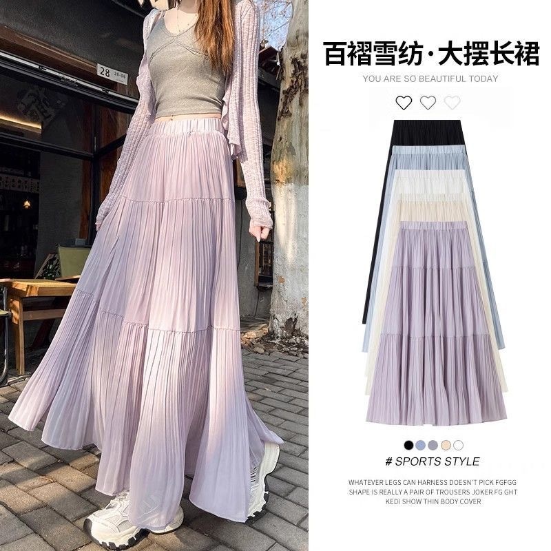 女性用パープルプリーツスカート 2025 春夏新作ハイウエストスリム A ラインカバー股大きな裾プリーツロングスカート送料無料