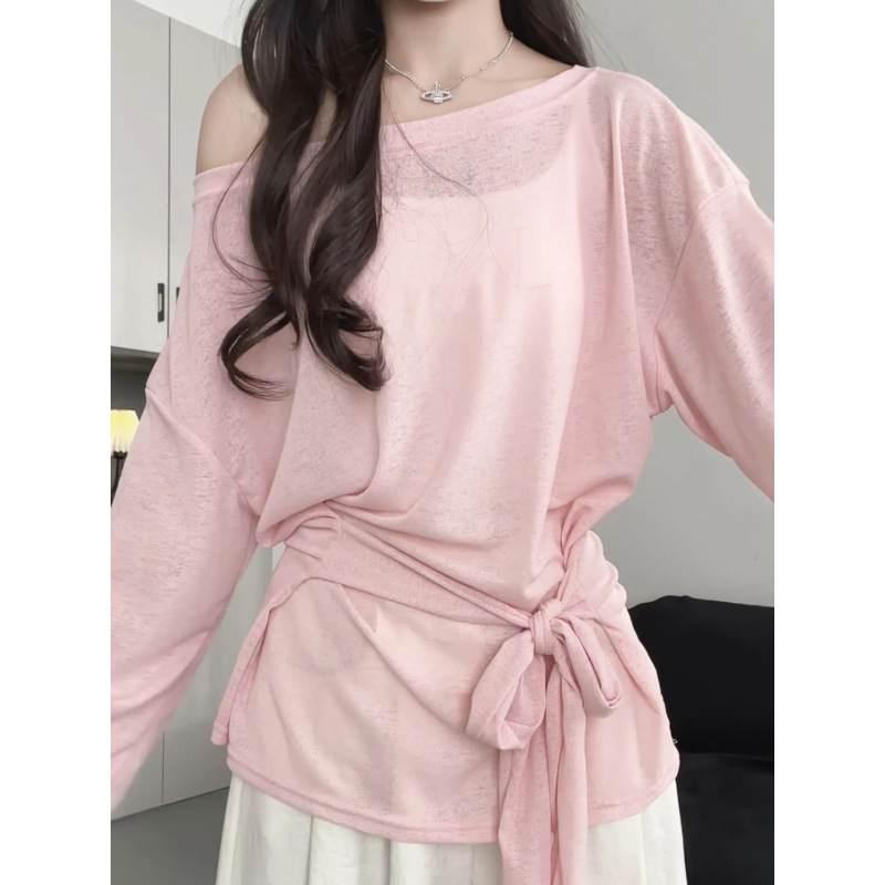 ピンクのストラップ付きレイジーブラウス女性の夏の新しいルーズTシャツ薄いデザインわずかに透ける日焼け止めアウタートップ