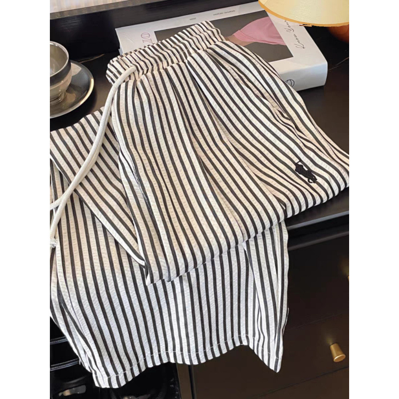 女性用ストライプパジャマ、夏用薄手ルーズストレートカジュアルパンツ、巾着刺繍、屋外で着用可能、ウォーキングパンツ、ホームパンツ