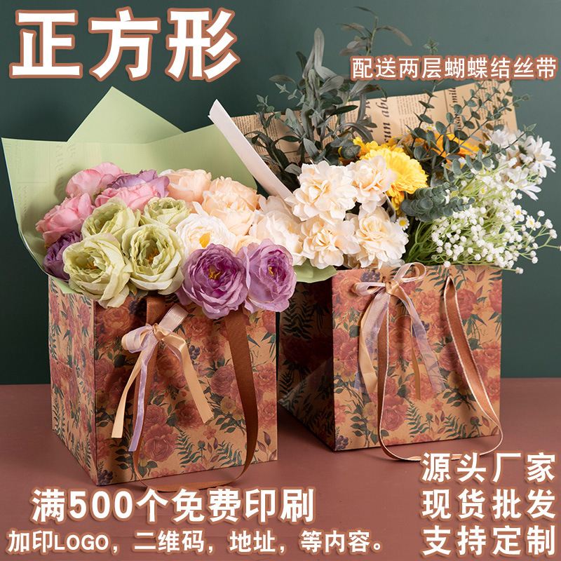 ギフトバッグ紙袋花プレゼント正方形ワイド底袋抱っこ袋手持ち花芸包装手提げ袋印ロゴ