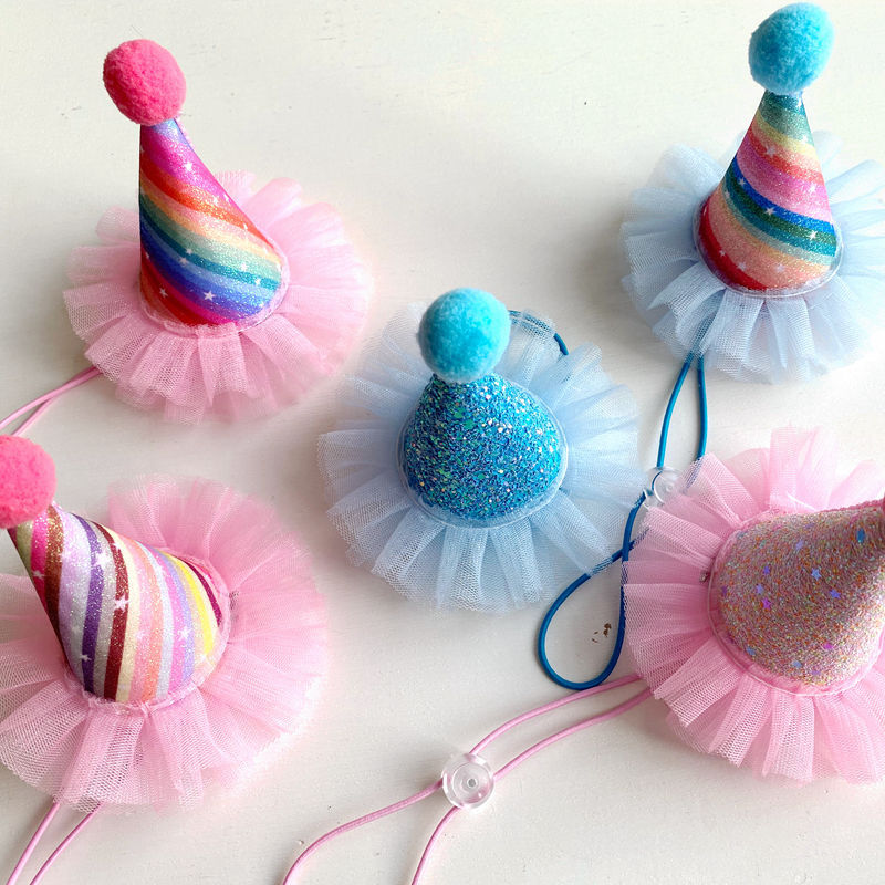 新しいペットの頭飾りペットの猫と犬の立体的でかわいいレースのキラキラした虹のテディパーティーの誕生日帽