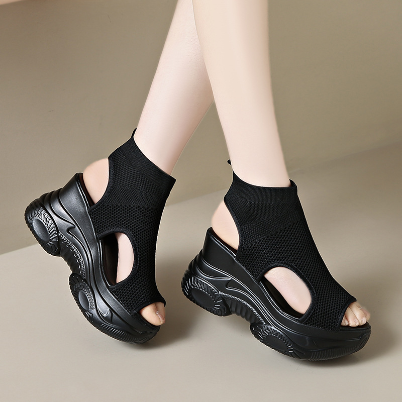 35-42 大きいサイズのウェッジサンダル夏の新しいフライ織メッシュ通気性のある魚の口ハイヒールカジュアルスポーツサンダル