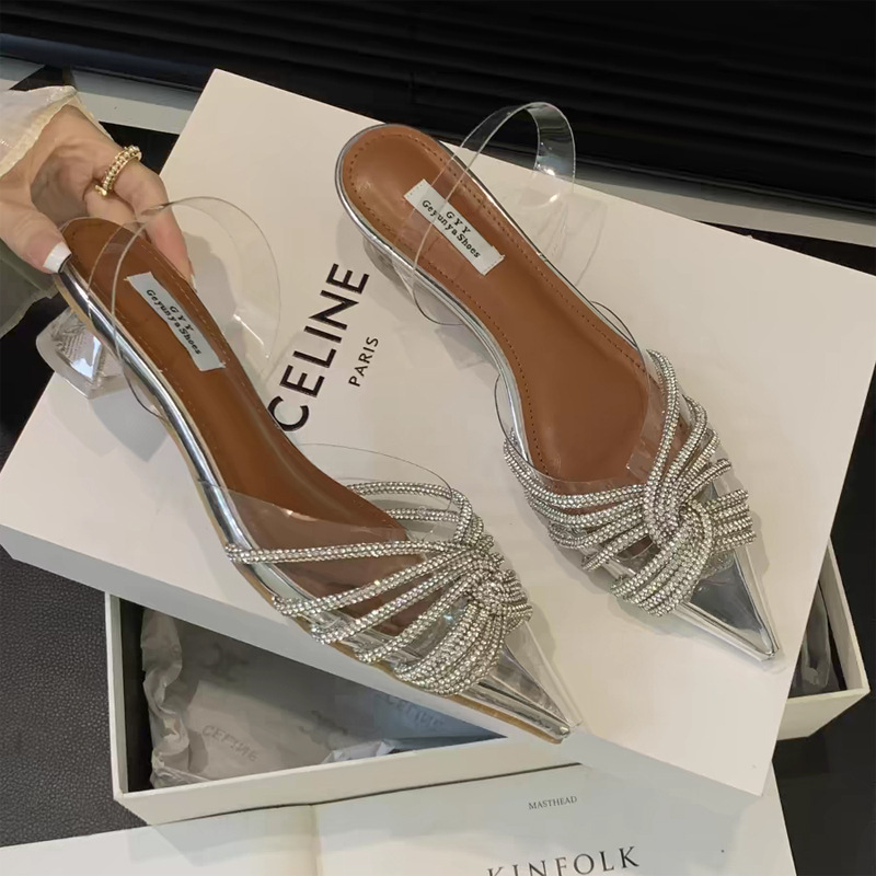 2025夏の新型韓国版ウォータードリル交差水晶靴の先のハイヒールのサンダルの43ヤードは国外の細い靴にまたがります。