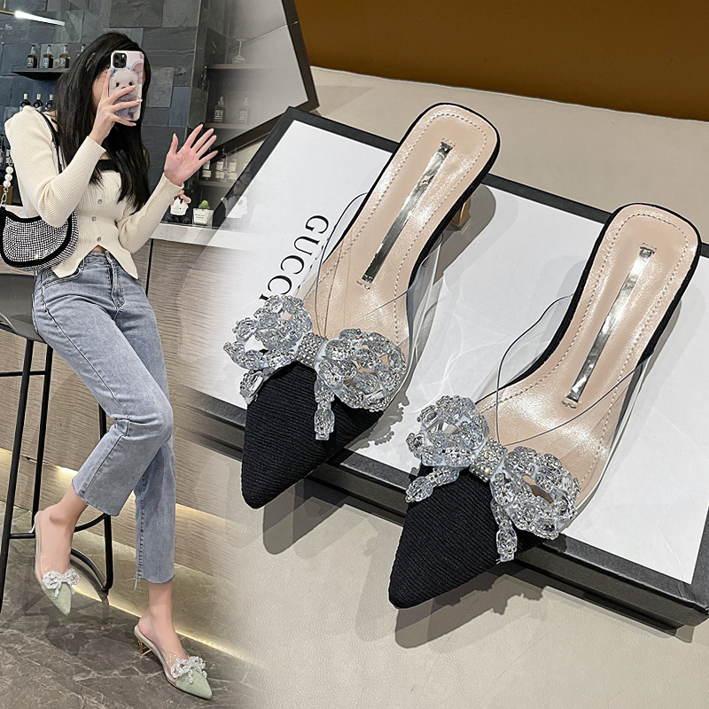厚いヒールフレンチトゥハーフスリッパ女性のための夏 2025 新しいハイエンドミッドヒールラインストーンリボンサンダル卸売