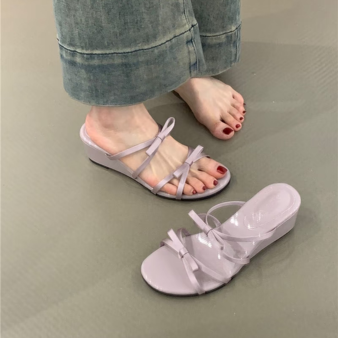 2025夏の坂とサンダルの女性の一字は蝶結びを持っています。