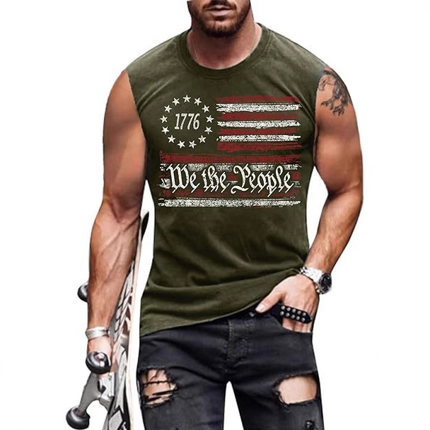 メンズクロスボーダー新しいスポーツ筋肉フィットネスベスト夏ルーズ独立記念日プリントUSAノースリーブトップ