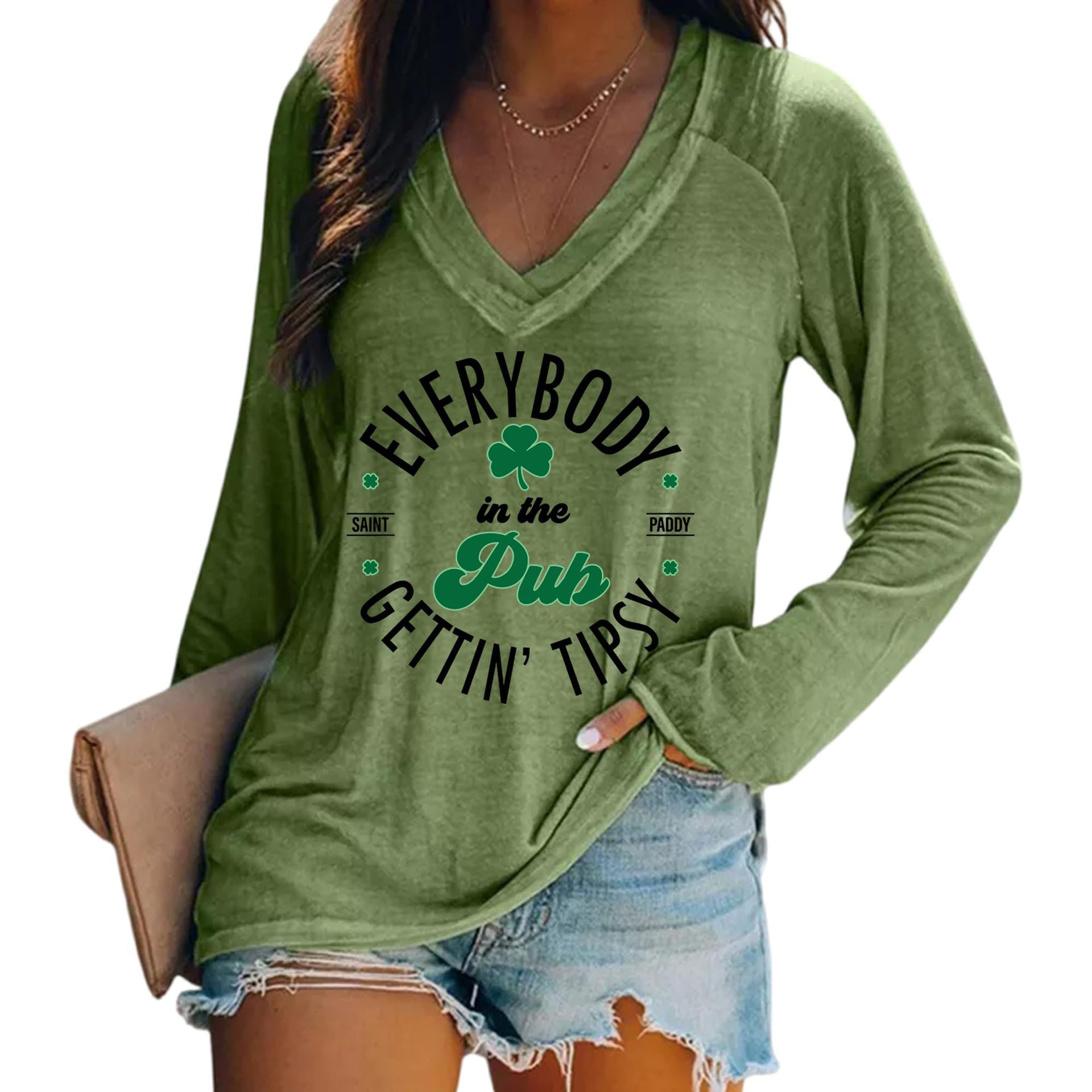 QH-クロスボーダー外国貿易新型長袖クローバー聖パ節プリント双vネック長袖tシャツアルファベットtシャツ