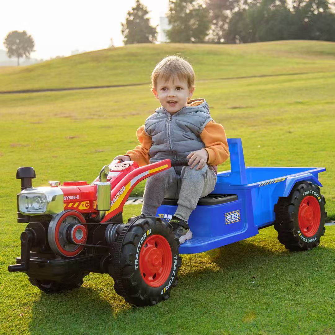 人の子供は電動四輪車の赤ちゃんの自動車四駆の手でトラクターの二人の男の子のおもちゃの車の大きいサイズを支えます。