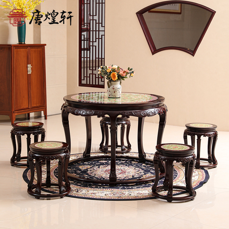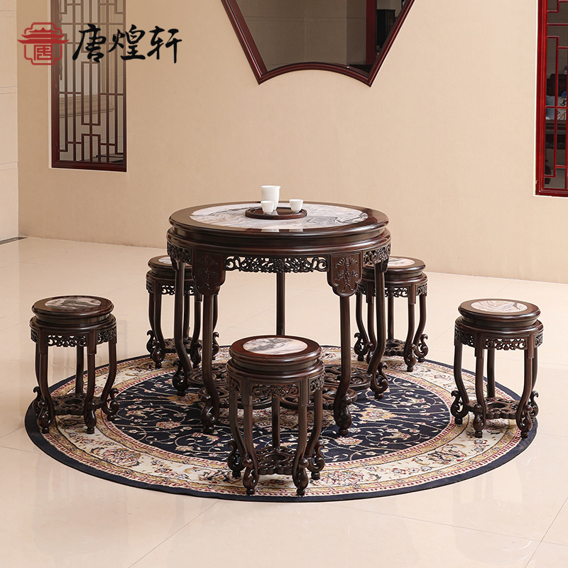 ラオス大紅酸枝鼓台交指黄檀五子登科円卓赤木実木鼓机一卓六腰掛け