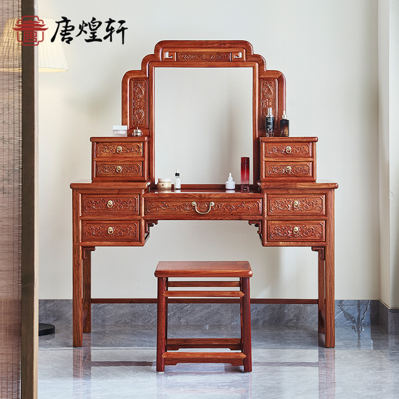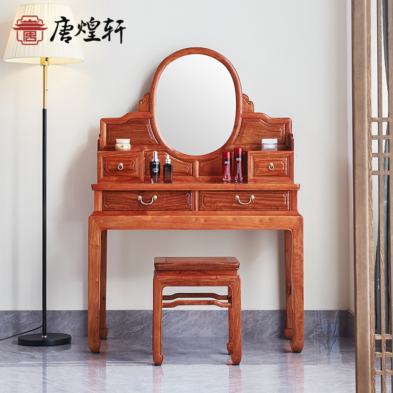 赤い木の家具のミャンマーの花梨は鏡を持って化粧台の腰掛けを組み合わせて2セットの大きい果物の紫檀を組み合わせて簡単に中国式の化粧のテーブルを作ります。