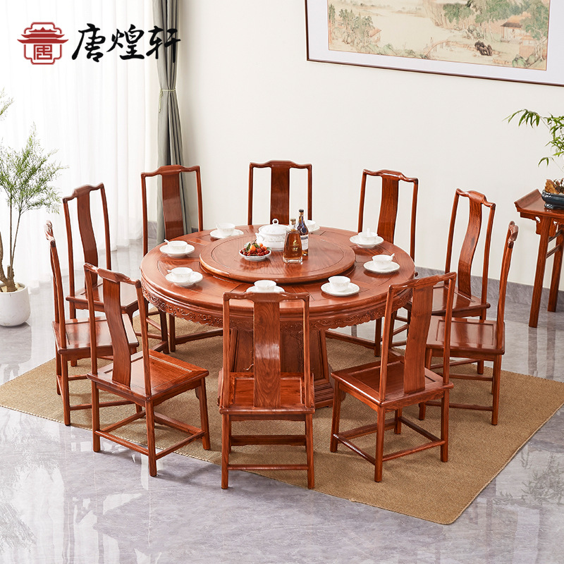 赤い木の家具のミャンマーの花梨木の丸い食卓と椅子の組み合わせの中国式の大きい果物の紫檀の円形の食事台の実木は回転盤を持ちます。