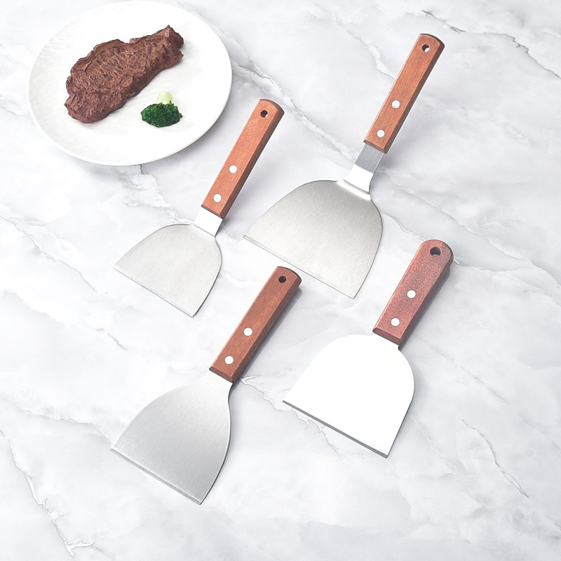 ステンレス鉄板焼きスパチュラ半円形ステーキパンケーキバーガースパチュラ日本料理ツール木製ハンドルステーキスパチュラ